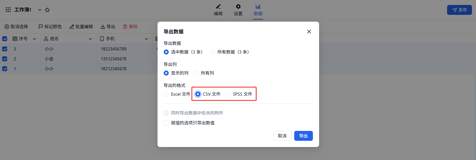 如需将数据导出为 CSV 文件和 SAV 文件,请在导出格式中选择所需文件类型,并点击「导出」。