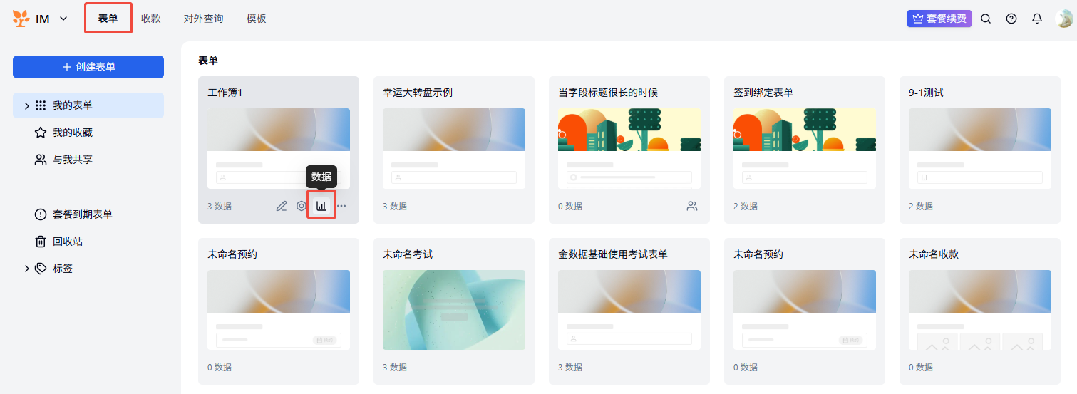 电脑端:打开 金数据官网 并登录你的账户,在表单列表中找到需要导出数据的表单,并点击「数据」按钮进入数据报表页面。