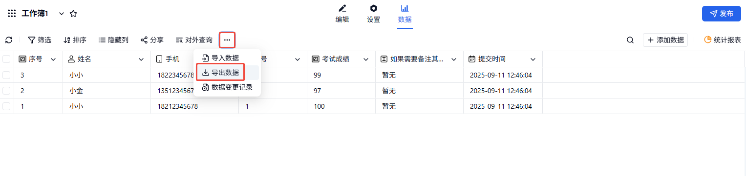 电脑端:在表单数据页面点击「...」按钮,然后点击「导出数据」。