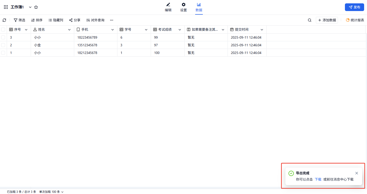 如果你需要将表单收集到的所有数据全部导出,请按照以下步骤操作: