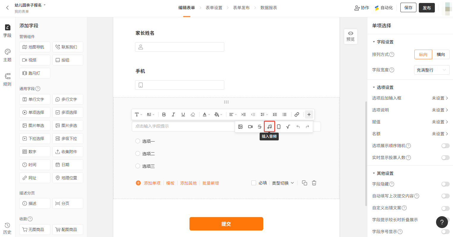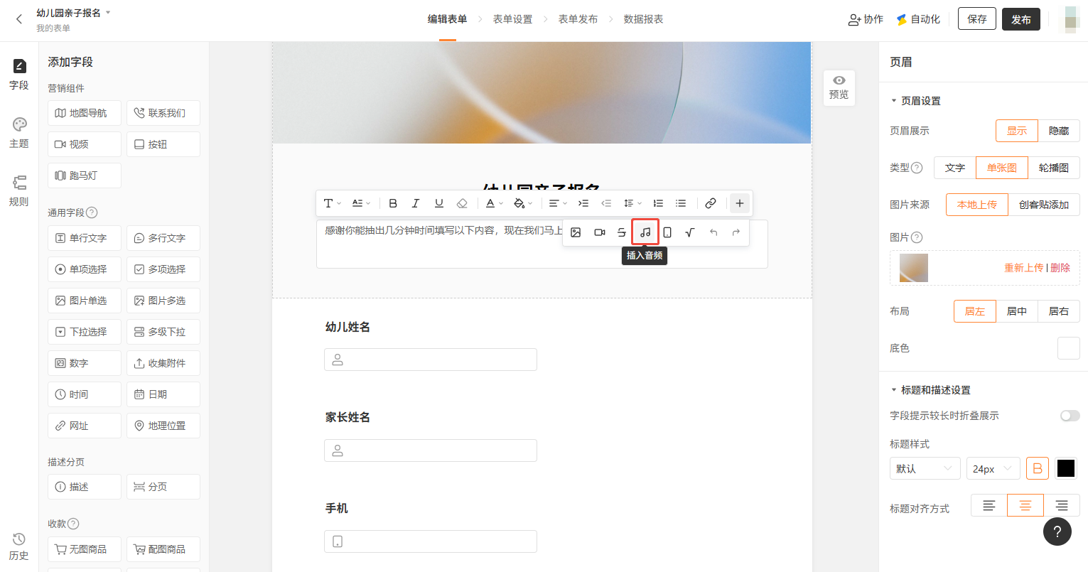 因为在加入网易云音乐的时候,没有去掉勾选「自动播放」。当编辑表单完成之后,金数据会尽可能真实的呈现表单预览的样子。你可以手动停止音乐,或者在获取音频网址链接的时候选择不自动播放。