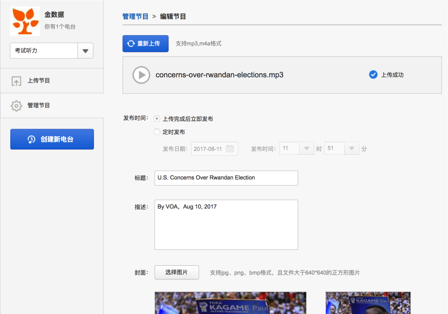 在创建好的电台中上传你的本地音频。