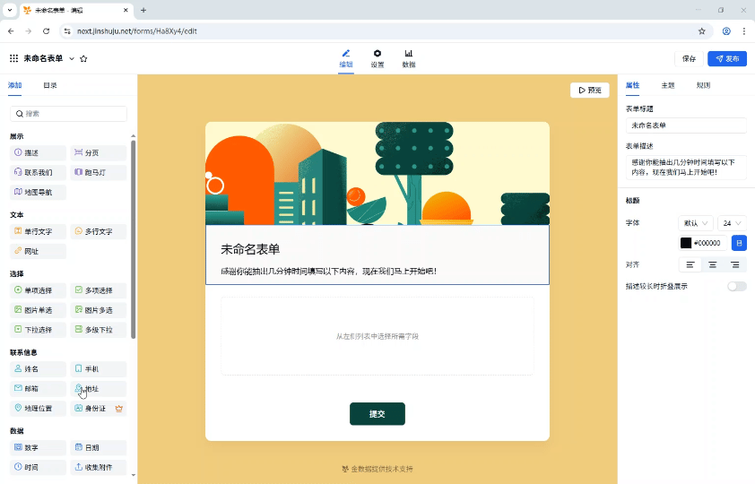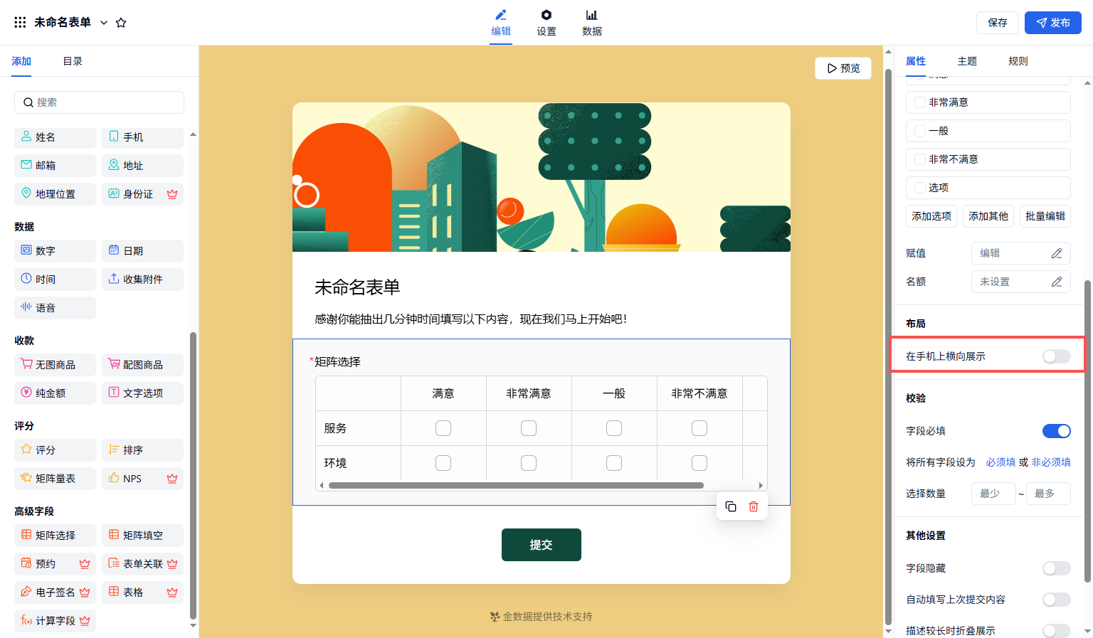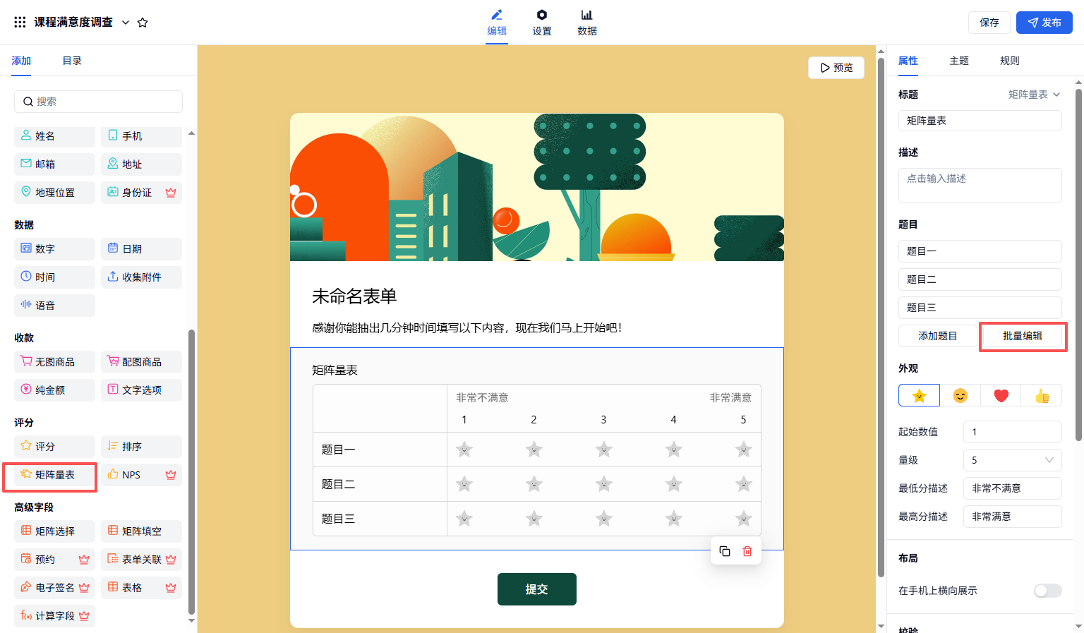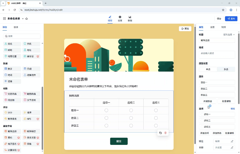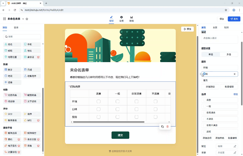 1、在编辑页面添加「矩阵选择」字段,可根据需求添加多个题目、选项,点击单个题目/选项可直接修改名称。