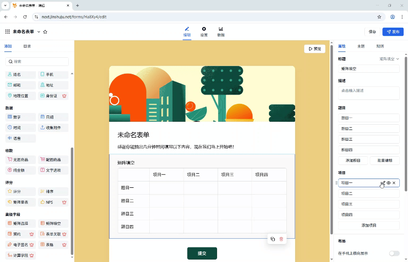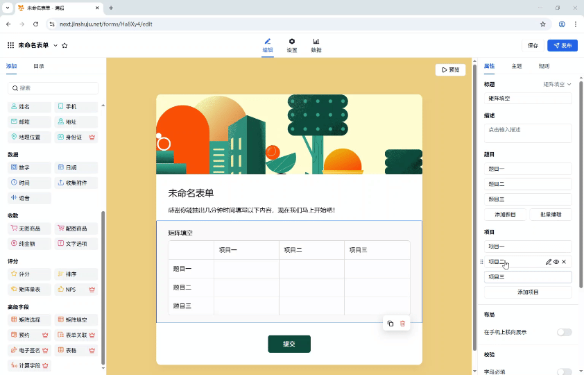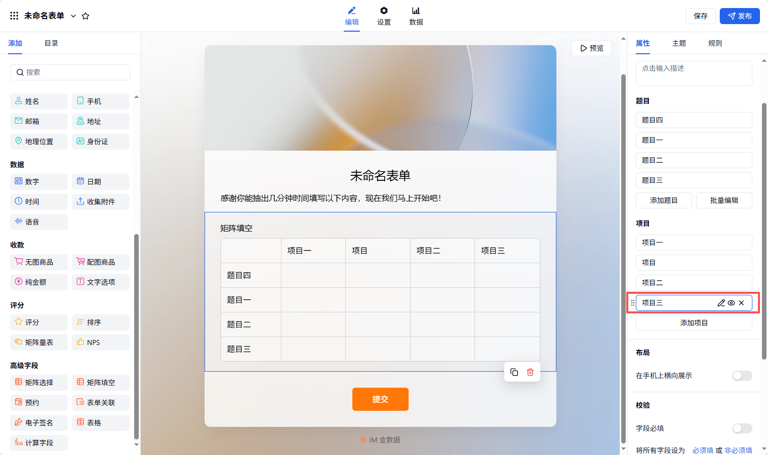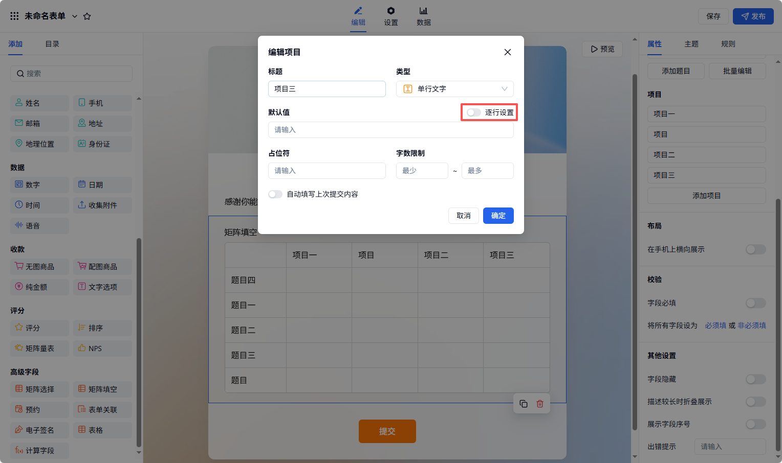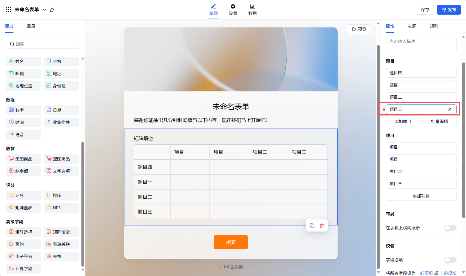 1、在编辑页面添加「矩阵填空」字段,根据需求添加多个题目(行数)、项目(列数),为每个题目、项目进行命名。