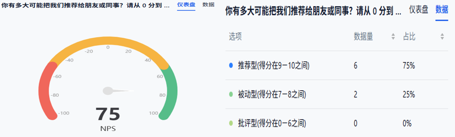 收集到数据后,在数据和报表页面可查看 NPS 得分及数据统计。