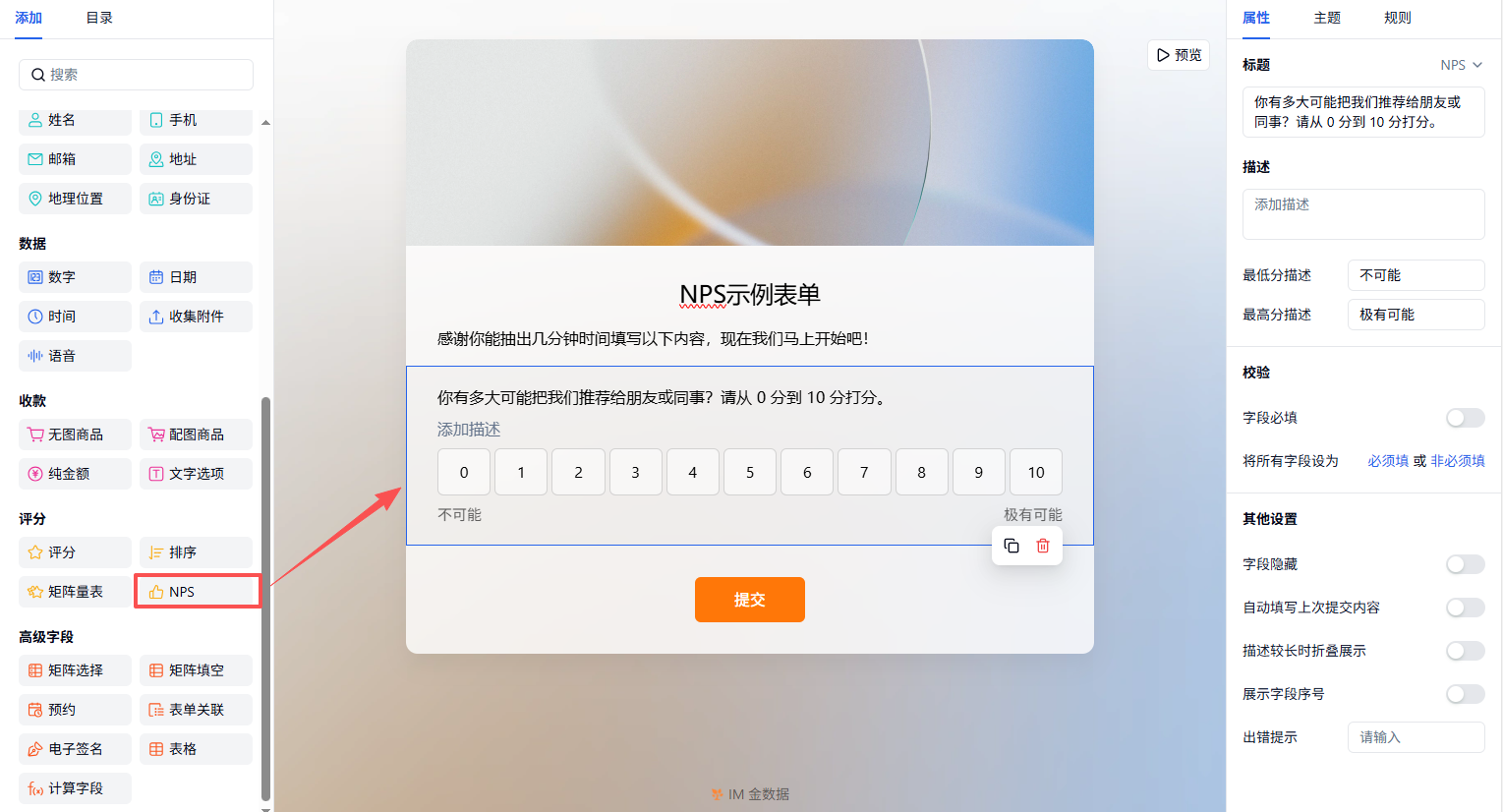 帮助你了解用户对你的产品或提供服务的相关人员的评价,目前「评分」字段支持通过下拉框选择 3-10 之间的量级,便于用户可以按需灵活设置量级。最左、最右位置支持自定义文案,限制 6 位字数。