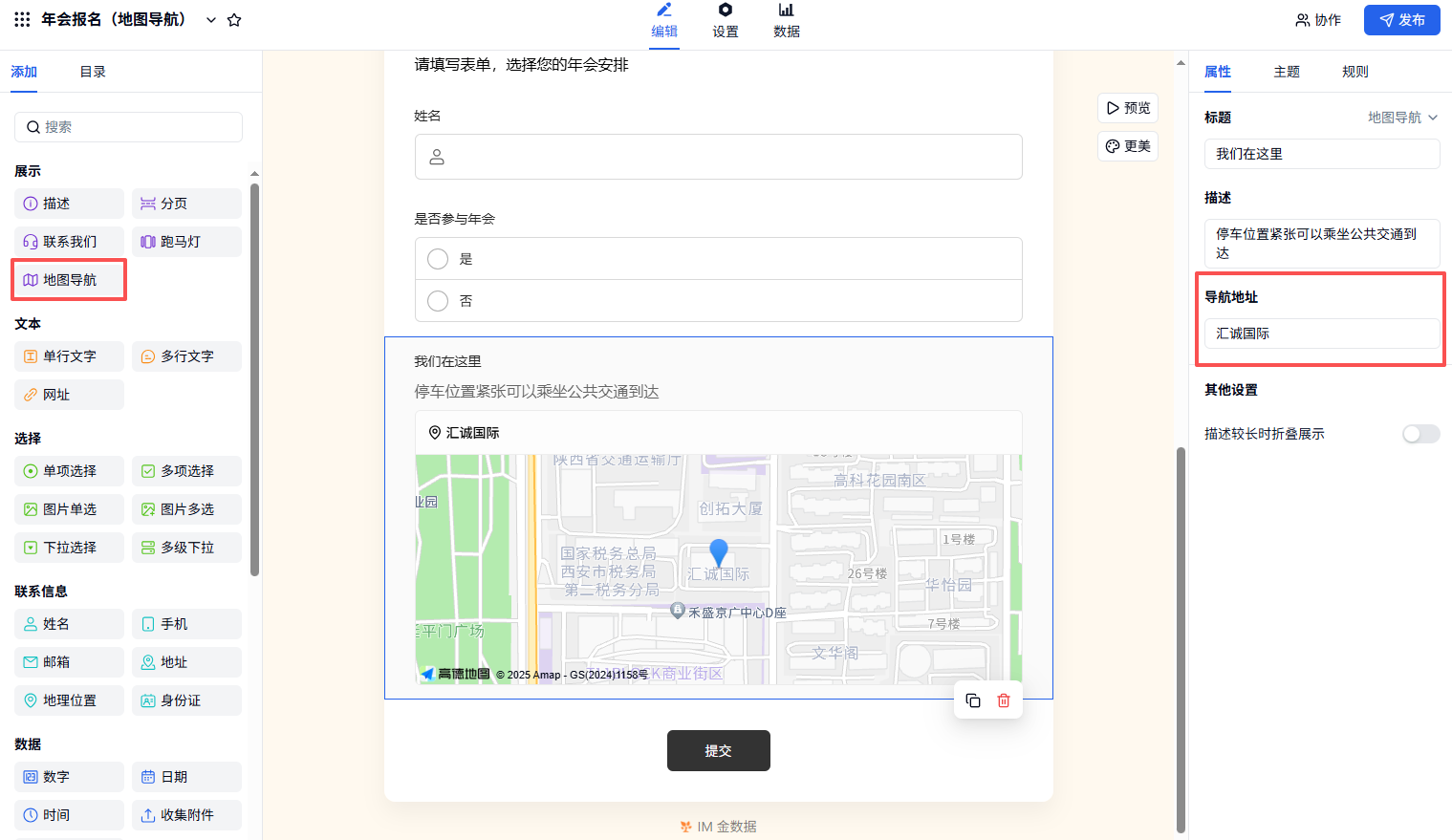 进入表单「编辑页」→ 添加「地图导航」,随后在右侧的编辑区域内,输入导航地址,系统会根据输入内容进行联想搜索。