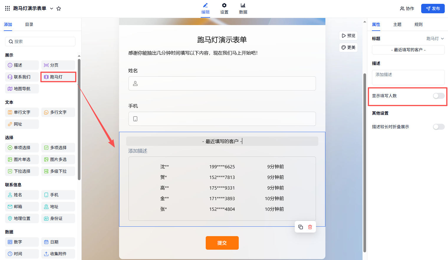 目前支持选用真实数据或模拟数据展示;设置显示 1、3、5 行展示及标题、背景色、字体字号自定义。当前仅支持展示姓名、手机、填写时间,且不可更改。