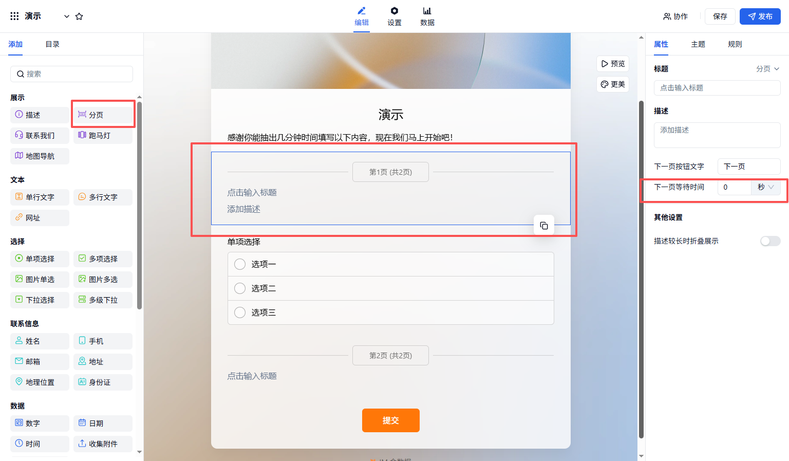 首页 / 帮助文档 / 表单制作与美化 分页字段 将表单划分为多个页面,提升填表体验。 分页字段按钮文案修改默认「下一页」,可自定义文案,修改后应用于所有分页按钮。分页字段按钮等待时间设置 可设置当前页面停留时长,适用于展示重要内容; 注意:最后一页不可设置。 分页字段禁止返回上一页 开启后无法返回修改已填内容; 第一页不可设置。 删除分页字段说明 无法直接删除「第 1 页」; 删除其他分页后,分页功能完全移除。 点击查看 分页的示例。 发布日期:2025年09月12日 有帮助? 是 否
