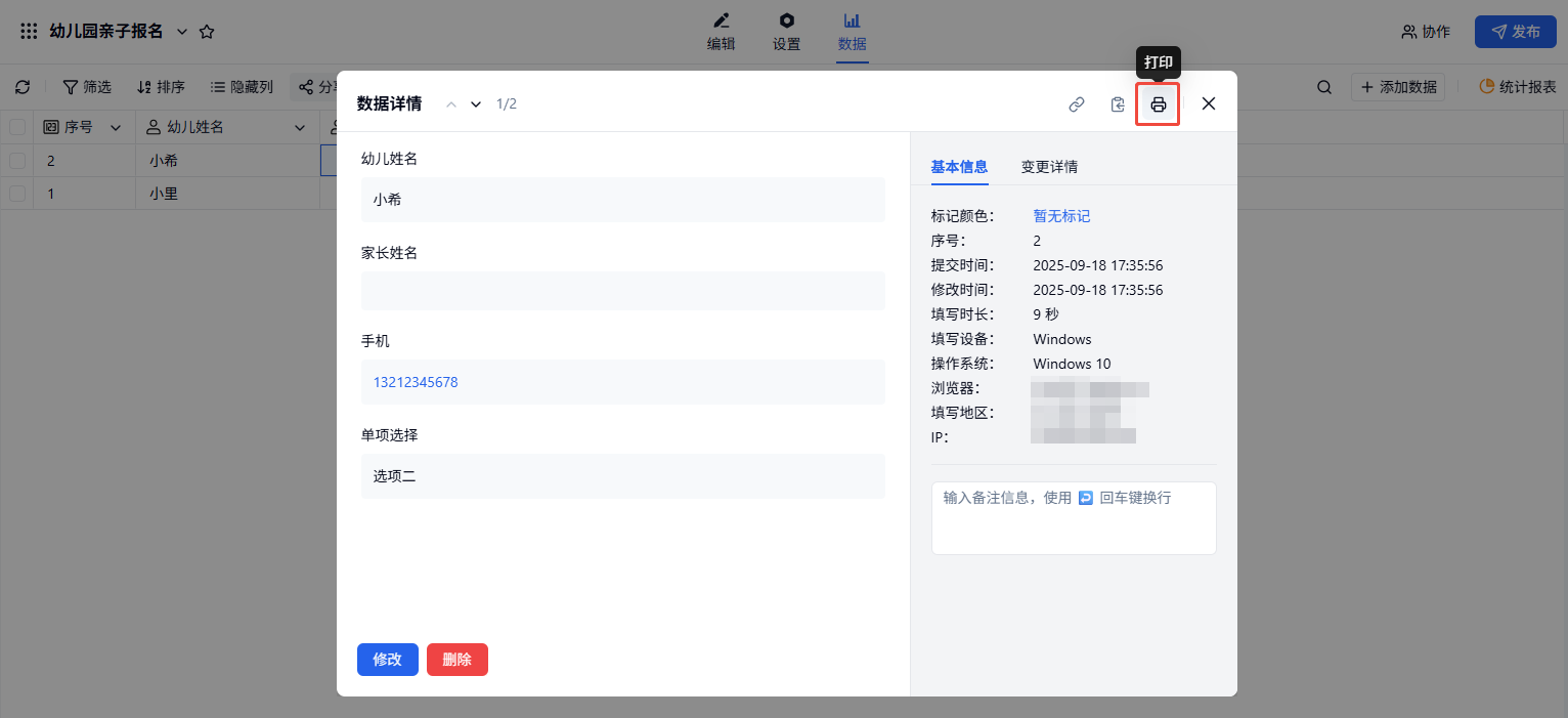 双击点开目标数据,进入数据详情,右上角点击数据打印。