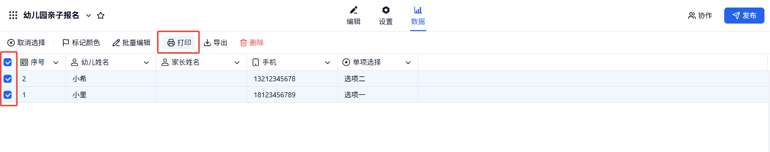 在数据页面选中目标数据后,右上侧选择「打印」。专业增强版套餐一次最多支持打印 30 条数据,企业版套餐一次最多支持打印 500 条数据。
