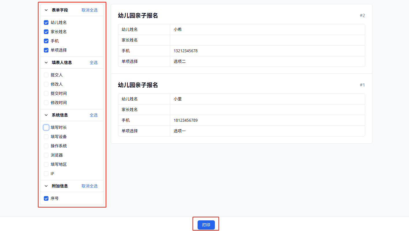 打印时,默认是打印全部字段,可以自主取消不需要打印的字段。填表人信息、系统信息和附加信息,你可以自由选择是否打印。