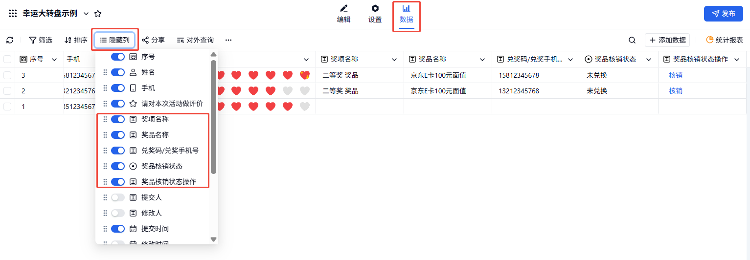 在表单的「数据」页面点击「隐藏列」,勾选操作、奖项名称、奖品名称、兑奖码/兑奖手机号、核销状态,可以查看每一条数据的中奖情况哦。