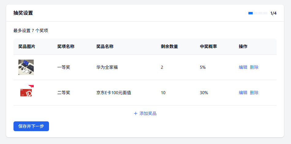 可以不设置所有的奖品中奖率为 100%。奖项最多可以设置 7 个,奖品数量、概率可单独设定并随时更改。奖品设置保存并收集到数据后,奖品类型不支持更改。支持设置实物奖品,也可以从 Excel 批量导入虚拟奖券。Excel 需为 xlxs 格式,尽量不要出现汉字和表头。第一列作为奖券号,如果有密码,则第二列为密码。点此查看 Excel 样例。