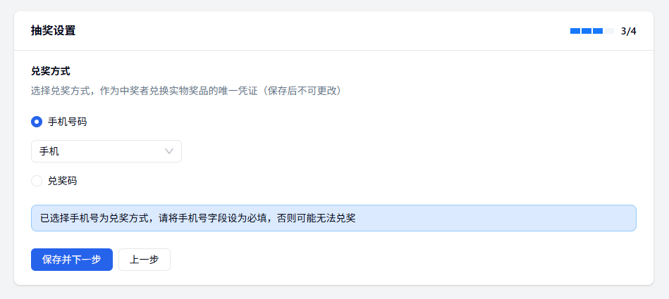 支持手机号或兑奖码。若选择手机号为兑奖方式,请将手机号字段设为必填,否则可能无法兑奖;兑奖码是系统自动生成的 8 位数字。