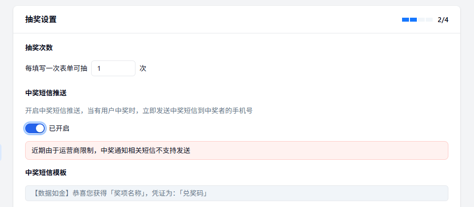 近期由于运营商限制,中奖通知相关短信暂不支持发送。