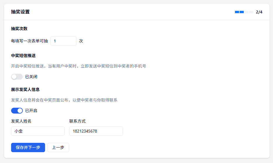 2)第二步设置抽奖次数(最多设置 20 次)、展示发奖人信息,考试表单还可以设置按分数段抽奖。