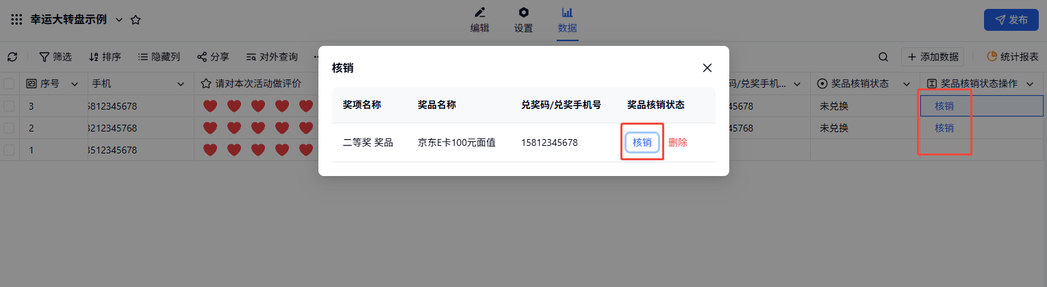 幸运大转盘核销,在表单「数据」页面,点击「核销」按钮,可对中奖数据进行核销。