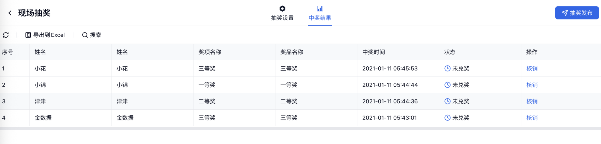 2)抽奖后可以取消重新抽,或者确认中奖,以应对现场各种情况。