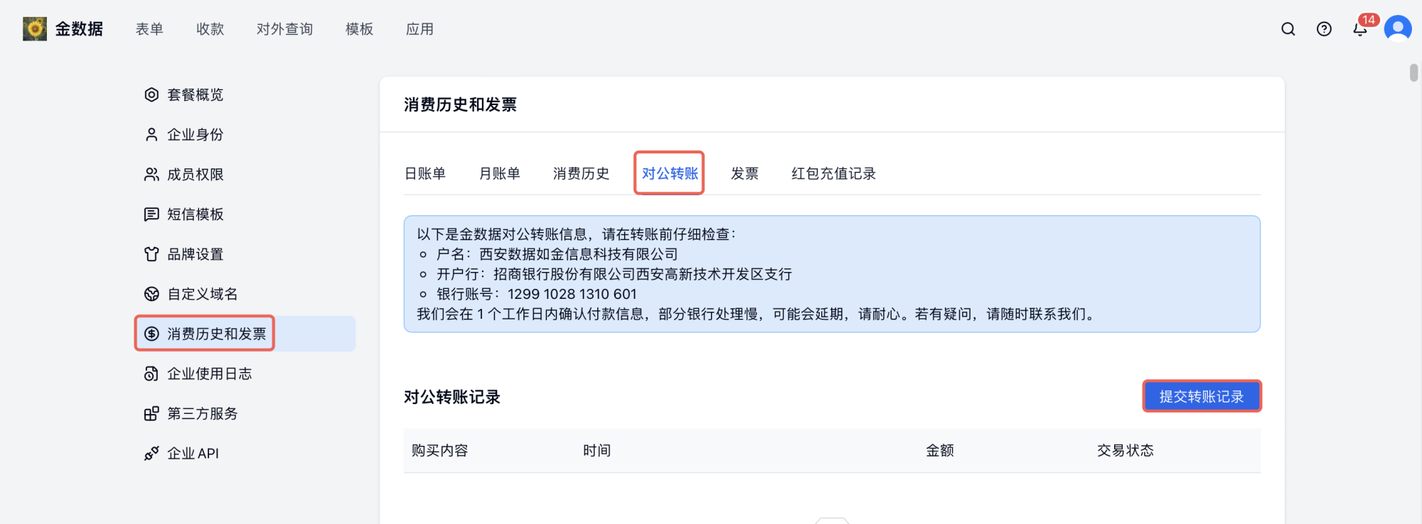 ⚠️注意:若使用对公转账,请转账成功后在「系统设置——消费历史与发票——对公转账」板块提交转账凭证或联系人工在线客服提交凭证,通常我们会在财务确认到款后的 24 小时内为你开通套餐。为避免业务受到节假日等外部因素影响,建议提前安排转账。对公转账因银行处理速度不同,到款可能稍有延迟。
