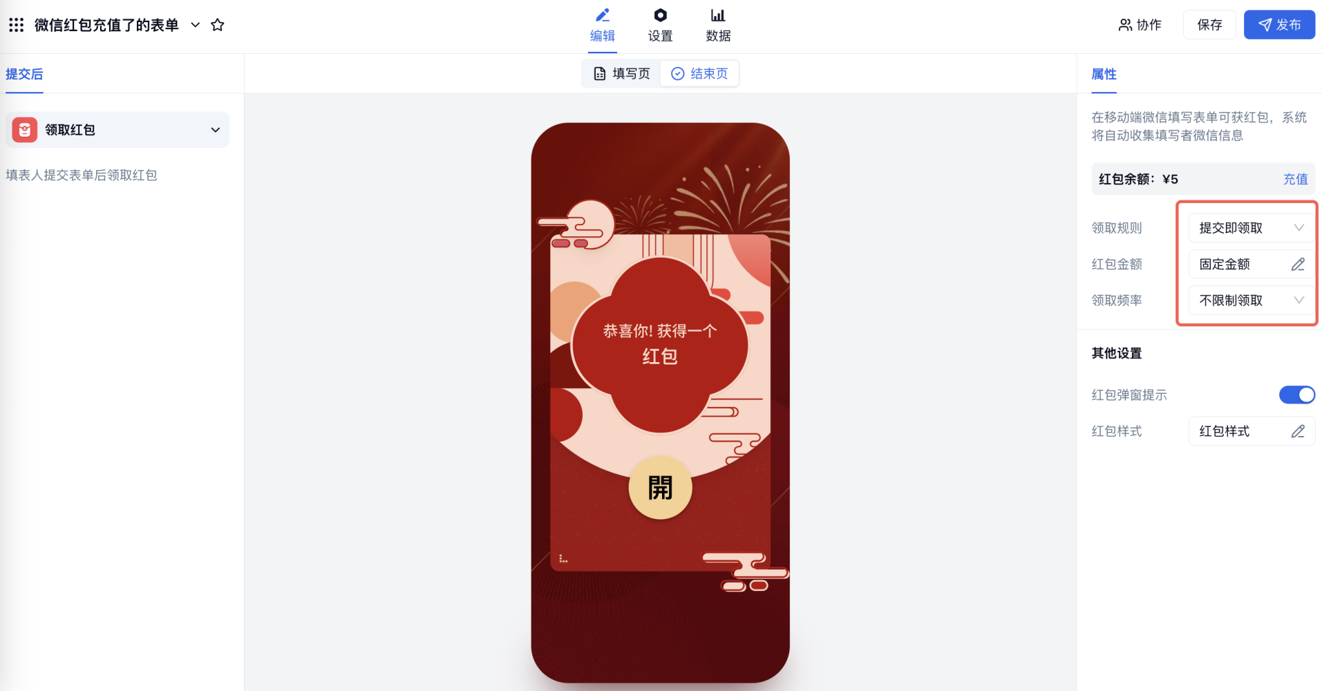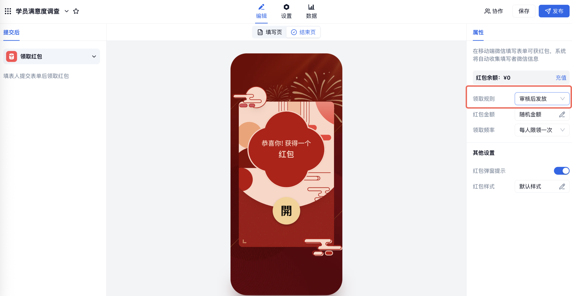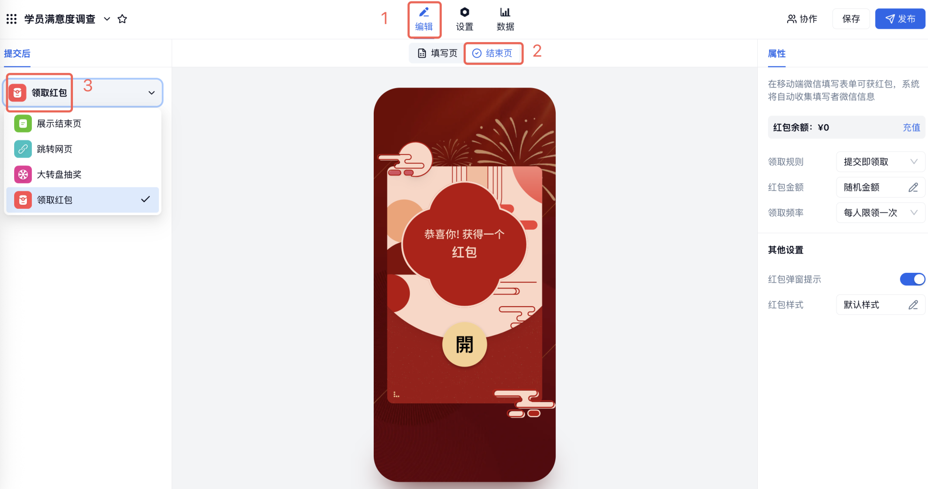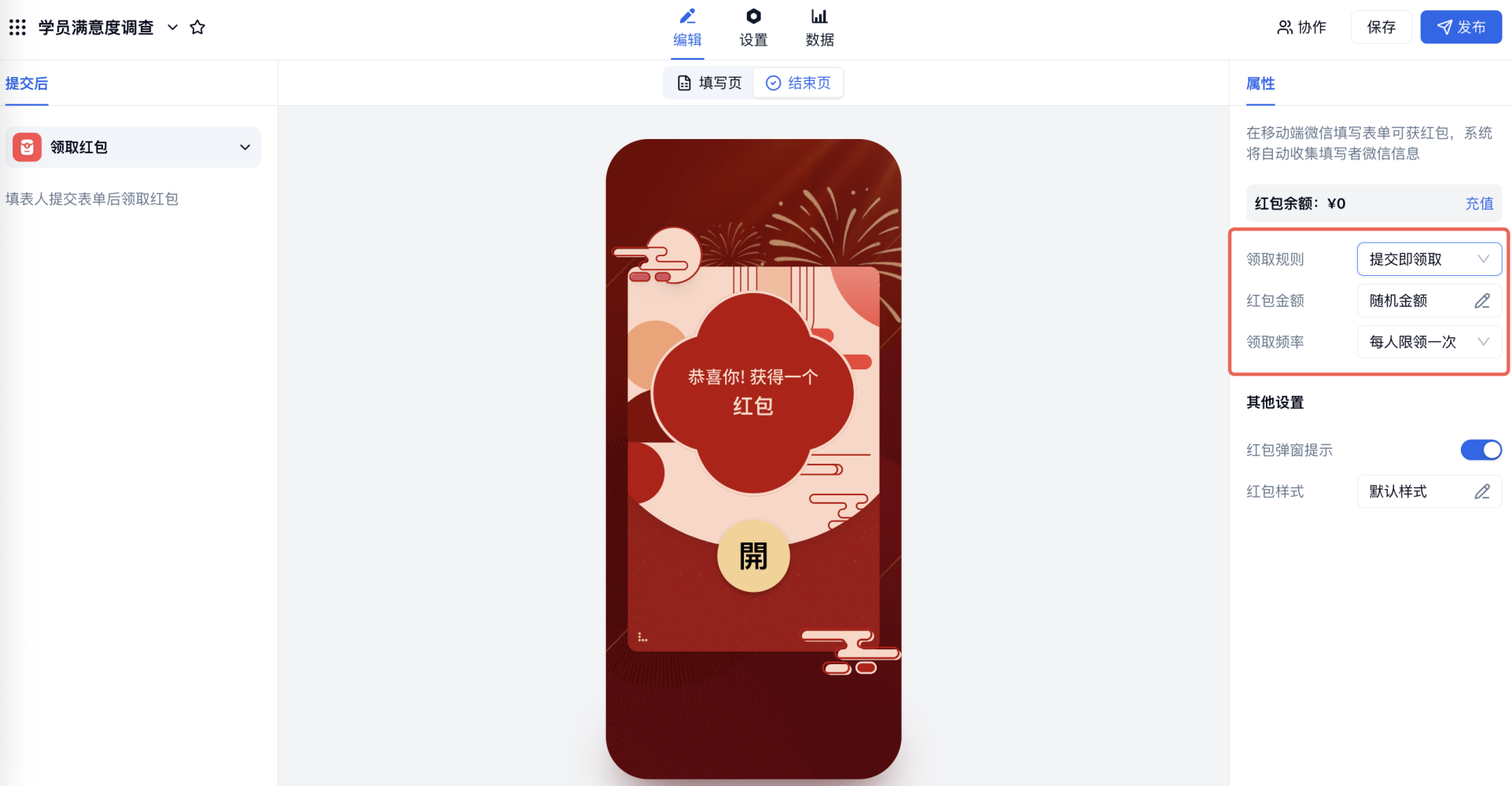 进入表单「编辑」→「结束页」→「提交后」,点击「领取红包」。