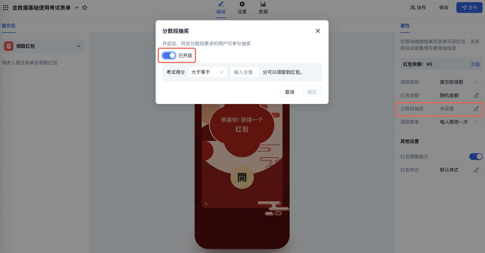 提交试卷后可给填写人发送红包,发放规则有:所有人提交即领取红包、概率领取、审核后发放、按分数段规则发送红包。 在「编辑」→「结束页」→「领取红包」→「分数段抽奖」。