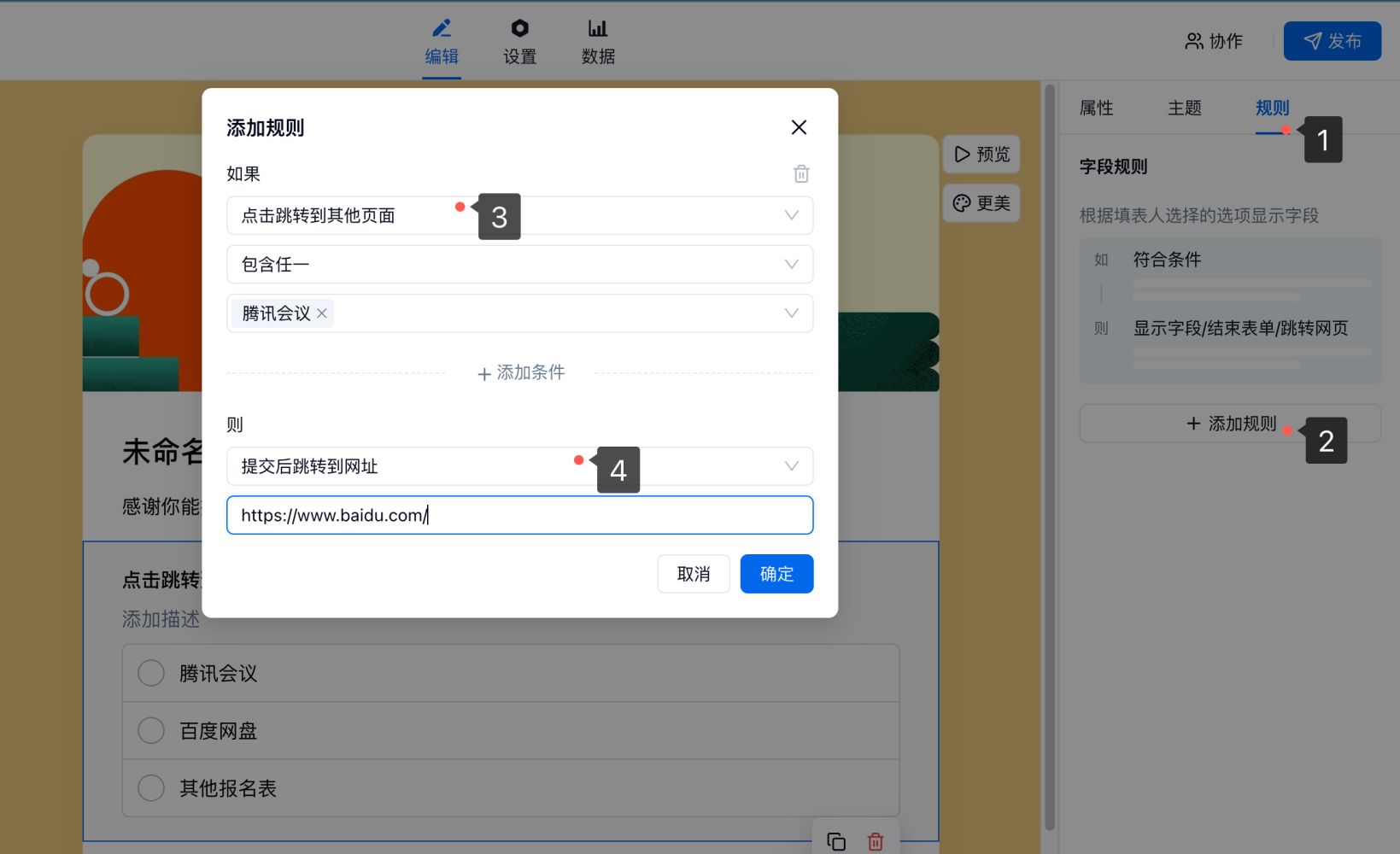 规则 n:在「字段 X」包含任一「选项内容」则跳转到「目标页面」