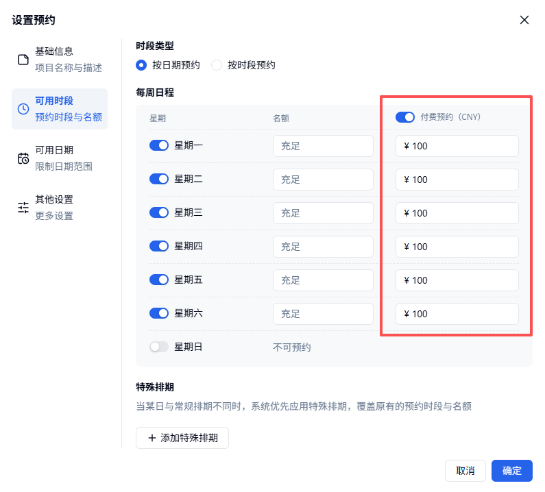 限制未来可约时间:如你的预约项目仅支持在未来一段时间预约,可设置具体时间范围,比如可以预约未来 15 天内的时间;