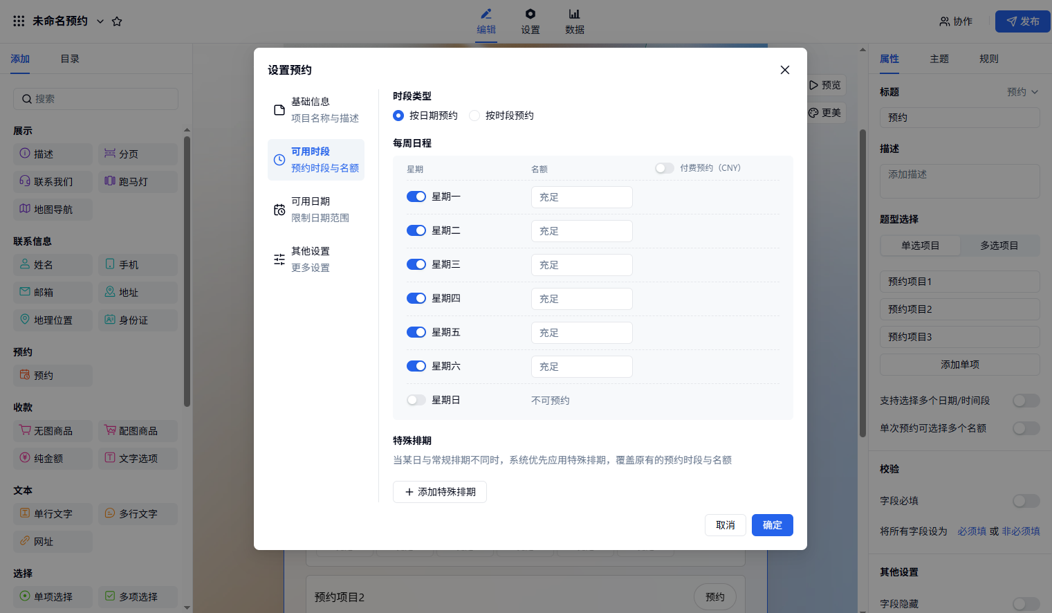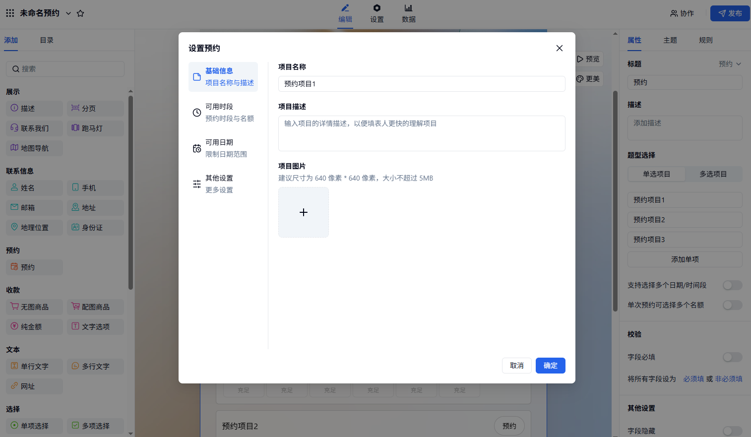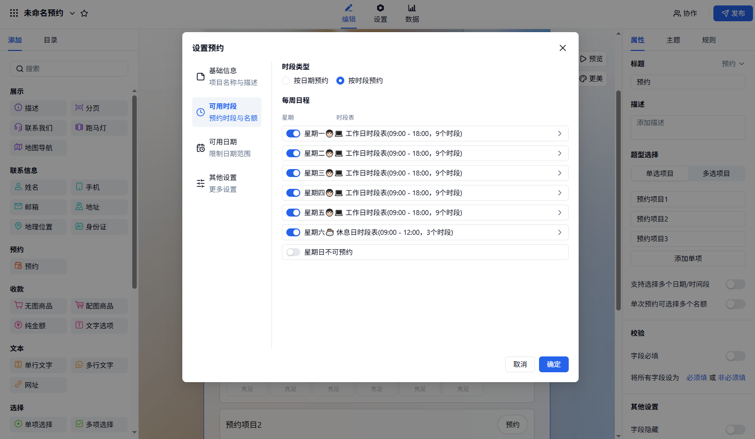 进入编辑页面,设置项目信息、可用时段、可用日期。