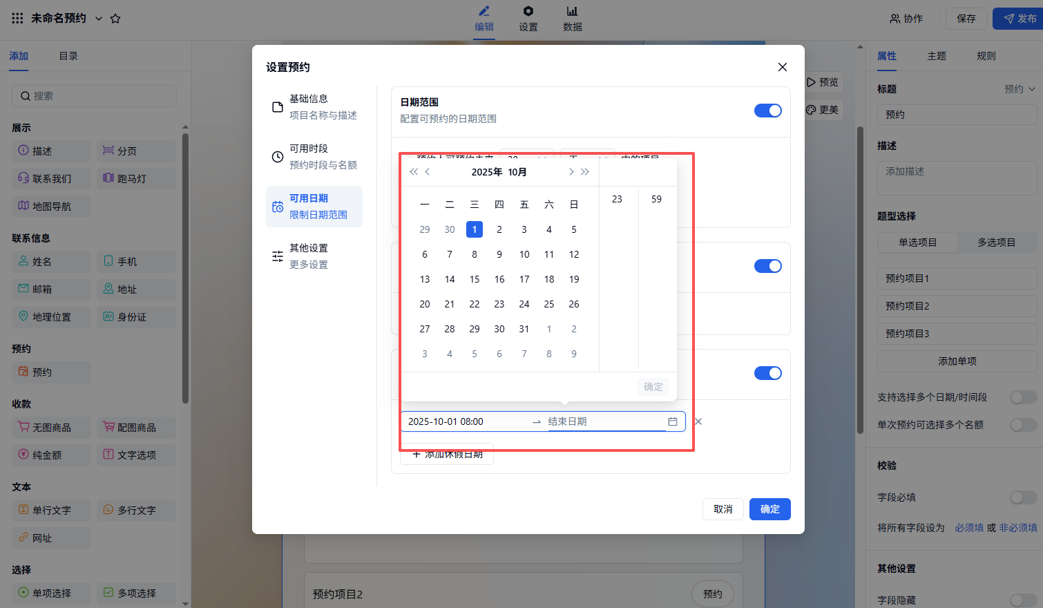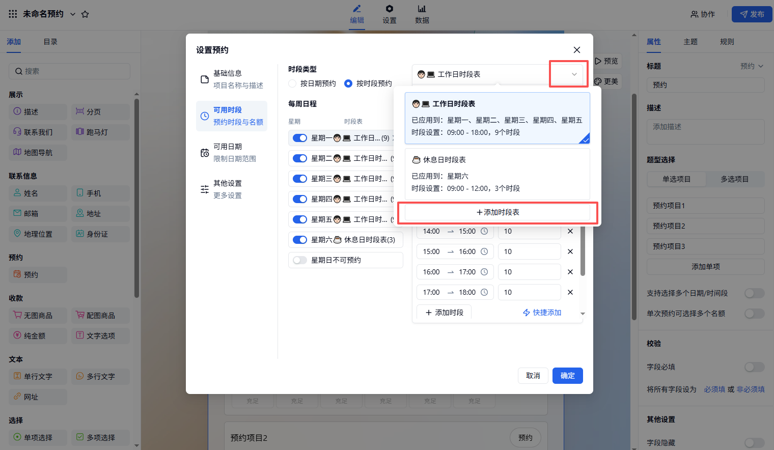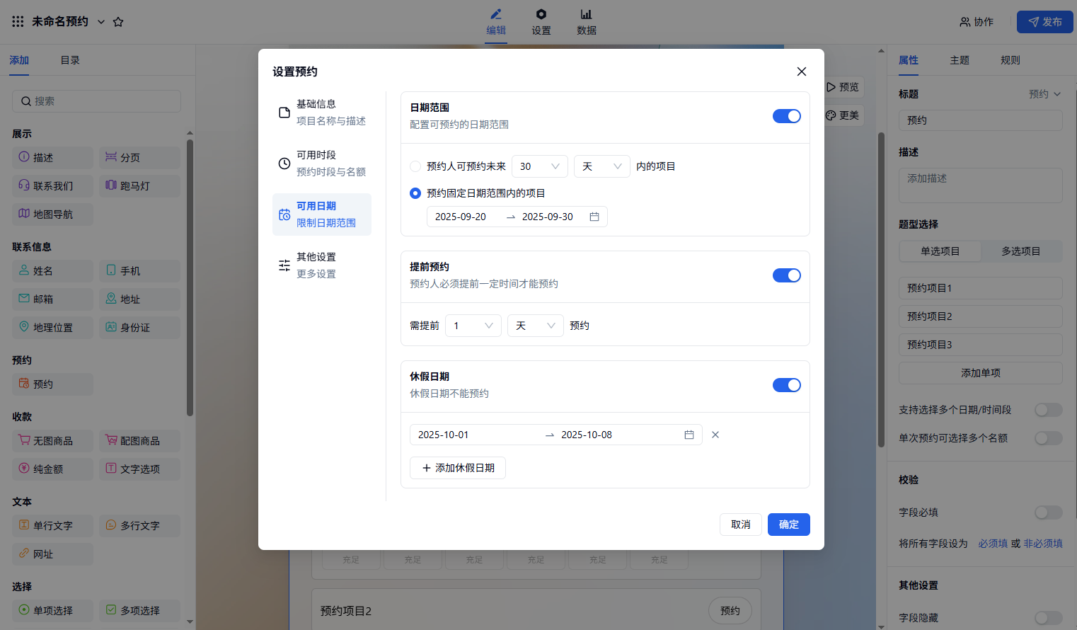 进入编辑页面,设置项目信息、可用时段、可用日期。