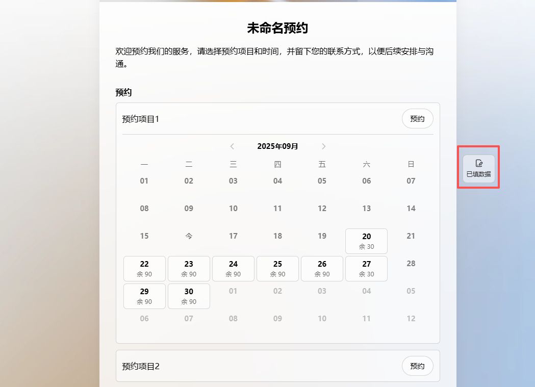 填表人视角:提交预约数据后,再次进入表单填写页面,可看到「已填数据」按钮,点击进入。选择需要修改/取消的数据,即可操作。