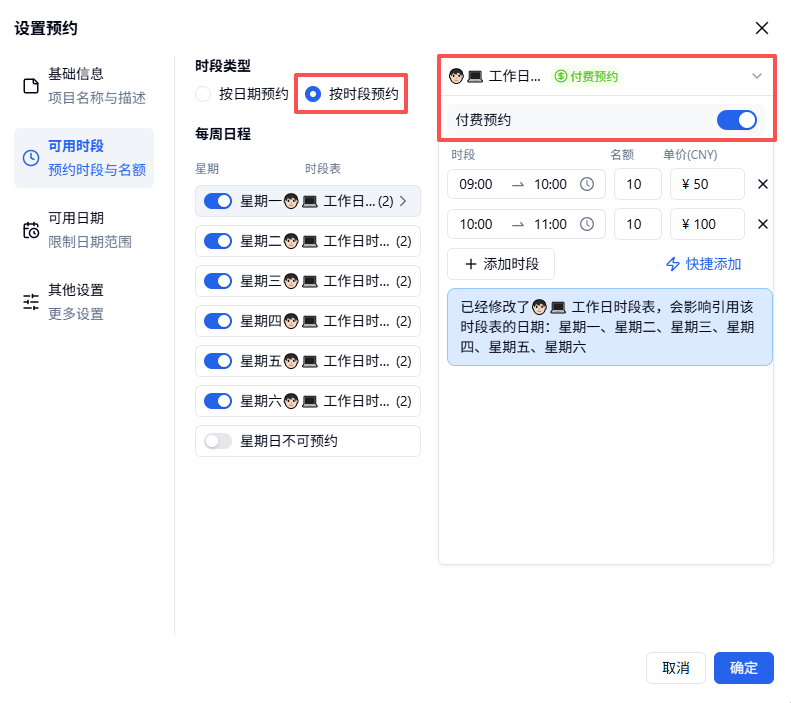 按时段段预约:我们帮你预置了工作日时段表,已应用到星期一、星期二、星期三、星期四、星期五每日