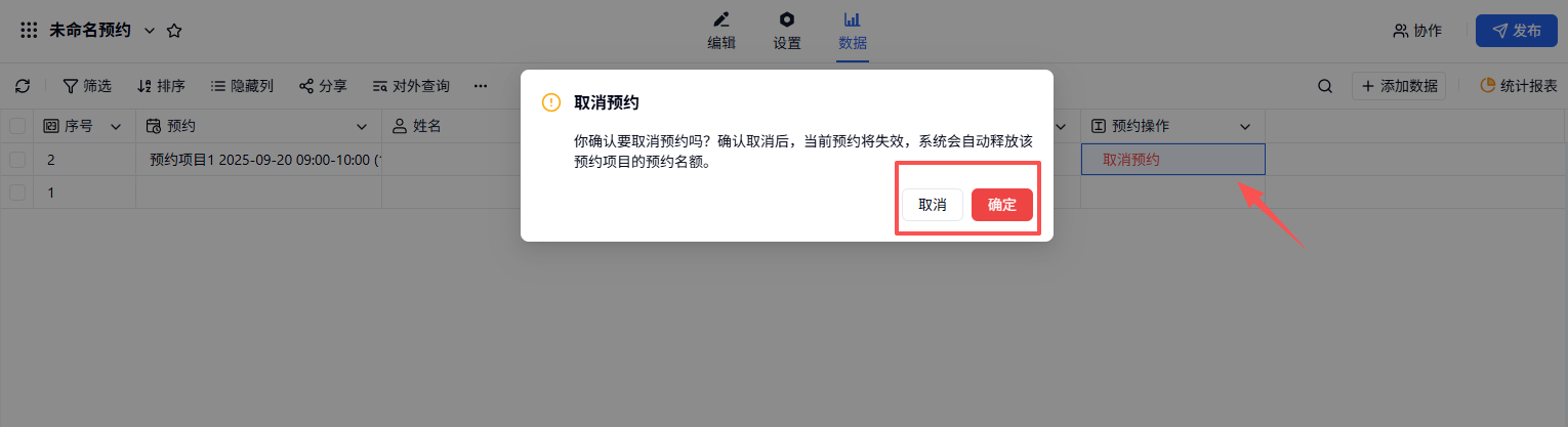 表单创建者在「数据」页面,可以操作取消填表人的预约,以便释放预约名额。