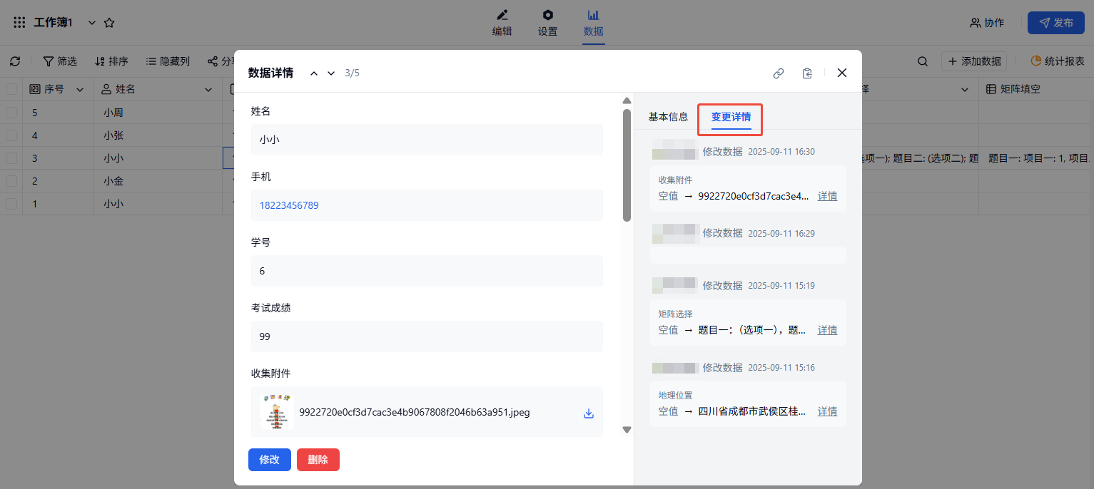 点击单条数据详情页,可以只查看当前数据删除字段、删除选项、恢复数据、修改数据、红包审核、取消预约、修改字段类型等变更记录。数据变更成功无法批量撤回,你只能根据变更详情,修改数据。