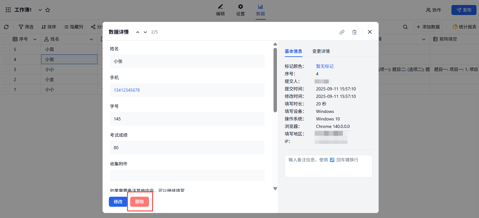 单击某条数据,进入该数据的详情页,可删除这条数据。该条数据被删除后,数据序号将随之被删除,数据序号不再连贯。