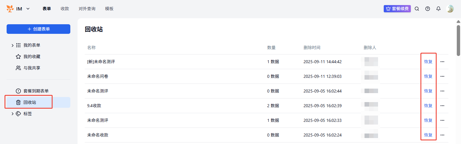 所有用户都能使用回收站,回收站会保留两年内删除的表单。