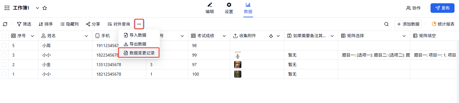 在数据页面,点击「...」→「数据变更记录」,可以查所有数据的操作记录有:修改/删除数据、批量编辑/删除、取消预约、红包审核、Excel 导入等,其中删除数据可操作恢复。