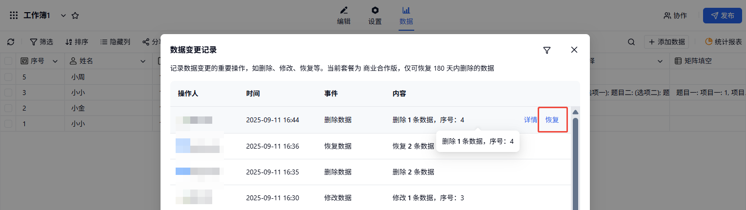 系统会记录数据修改/删除的时间、序号和操作账号,你还可以自行恢复被删除的数据。免费版在删除数据后不可恢复,也无法查看数据删除详情。