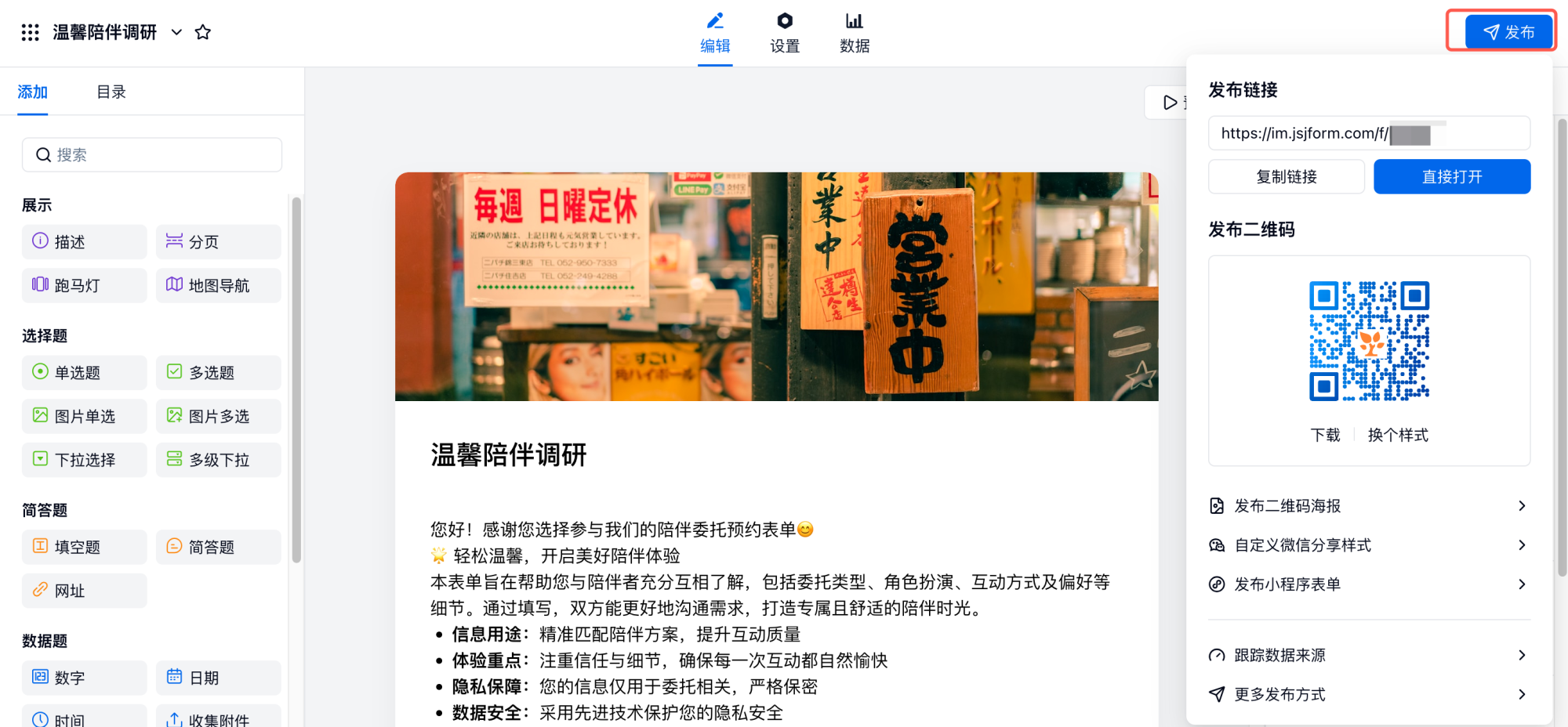 💡 温馨提示:此处的「发布」功能仅用于获取链接和二维码,不会自动将表单投放到其他平台。
