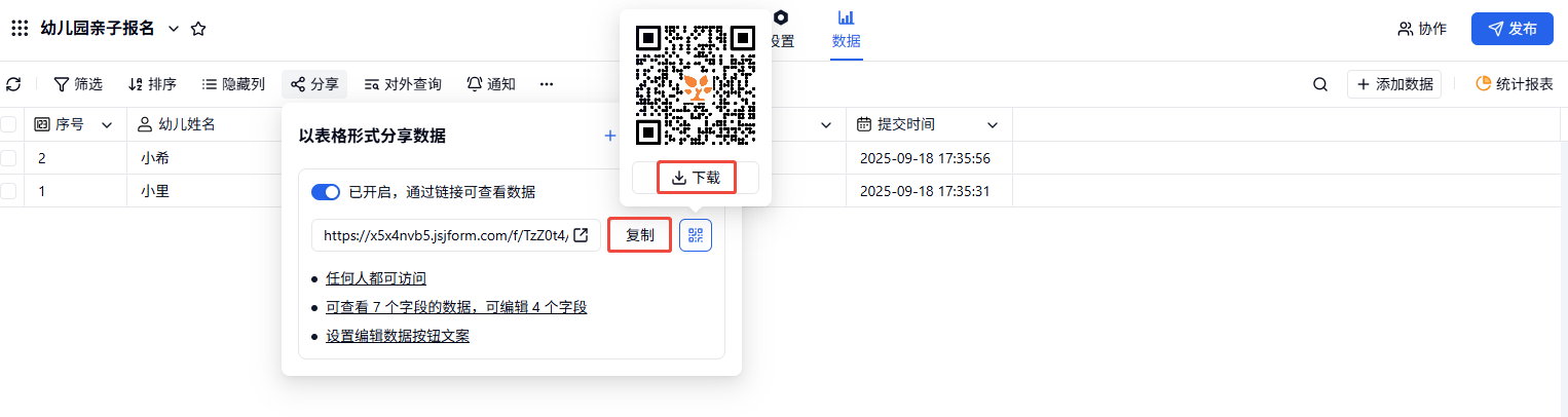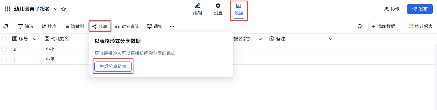 1.电脑端 登录账号 后,进入表单「数据」→「分享」,点击「生成分享链接」。