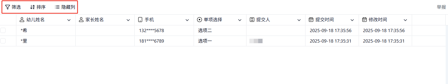 查看人打开结果分享地址后,可以点击「筛选」「排序」「隐藏列」自主调整页面展示。