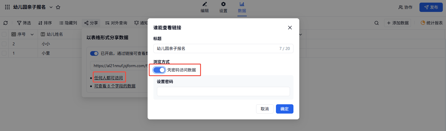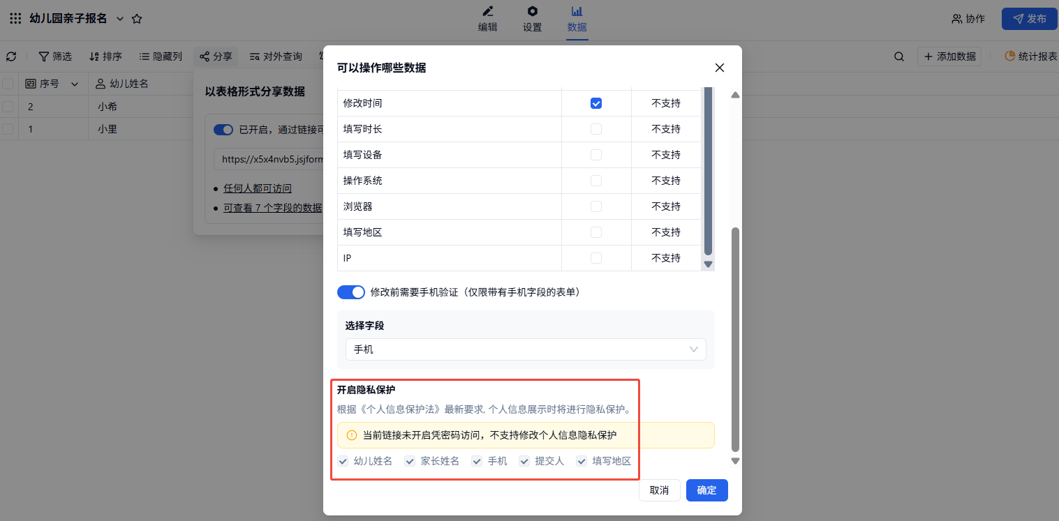 可以为姓名、手机等个人信息开启「隐私保护」,避免信息泄露或滥用,系统将对这些信息做脱敏处理,对外展示的数据是 184****0000 样式。如果需要展示完整的个人信息,需要设置「凭密码访问数据」。