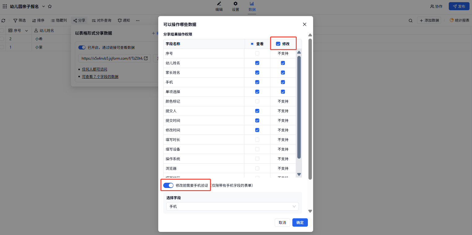 可自定义勾选允许修改的字段,如表单中包含「手机」字段,可勾选「修改前需要手机验证」;