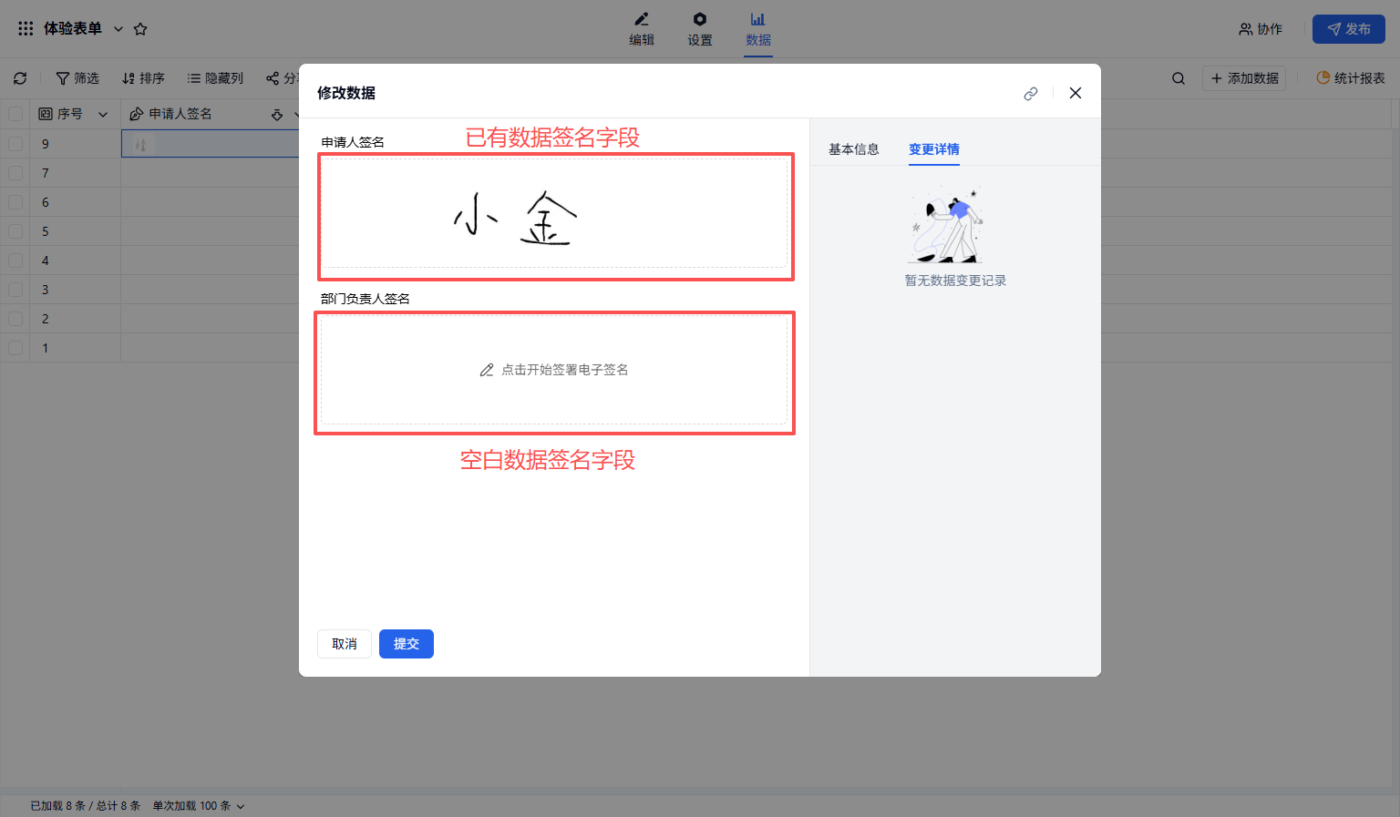 答:已有数据不可修改,空白字段可补充签署。例如审批流: