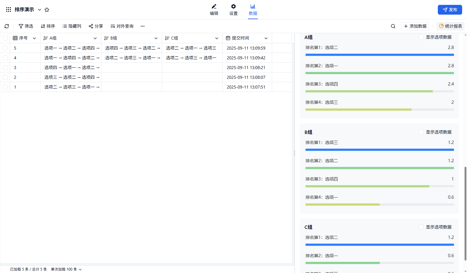 「排序」字段按照统计规则计算各选项综合排名,平均分数越大,排名越靠前。当选项平均分数出现一致时,则根据选项内数据的波动情况来选择方差较小的选项名次靠前。