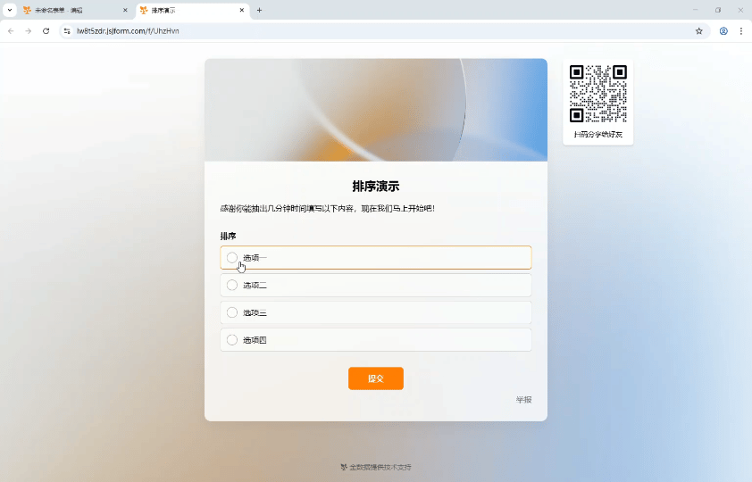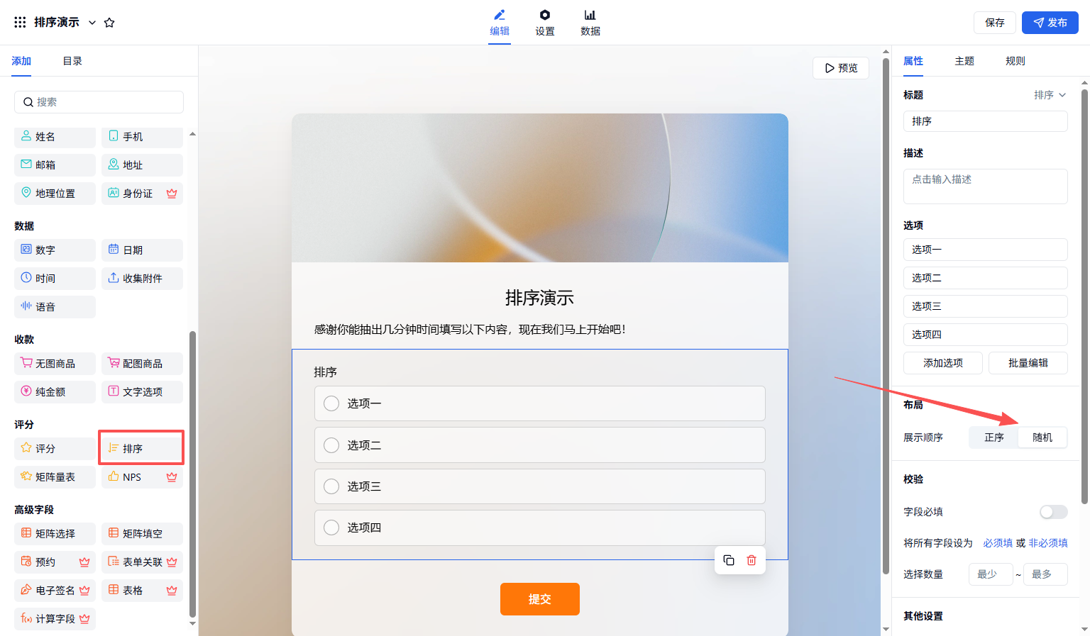 进入表单的「编辑」页面,添加「排序」字段,即可开启「选项拖拽排序」功能。