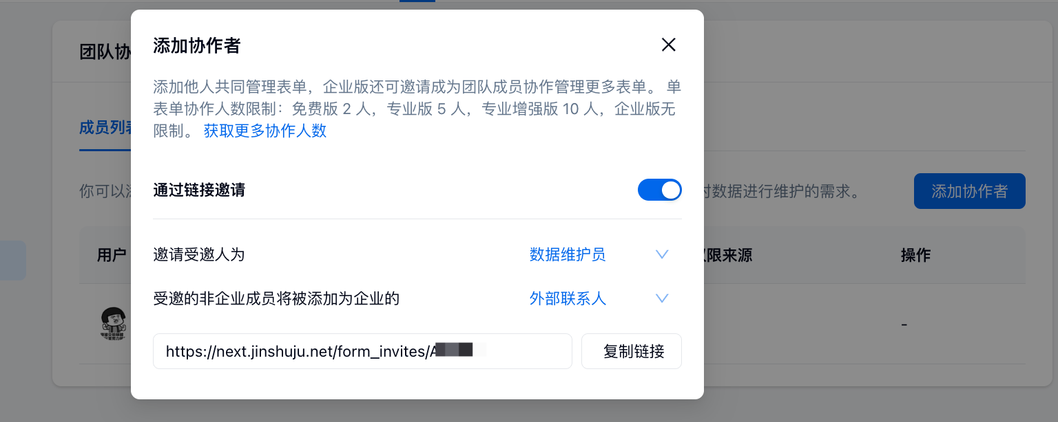 表单外部协作者定义:企业账户创建的表单,共享给非本企业的金数据用户时,该用户被标记为「外部协作者」。