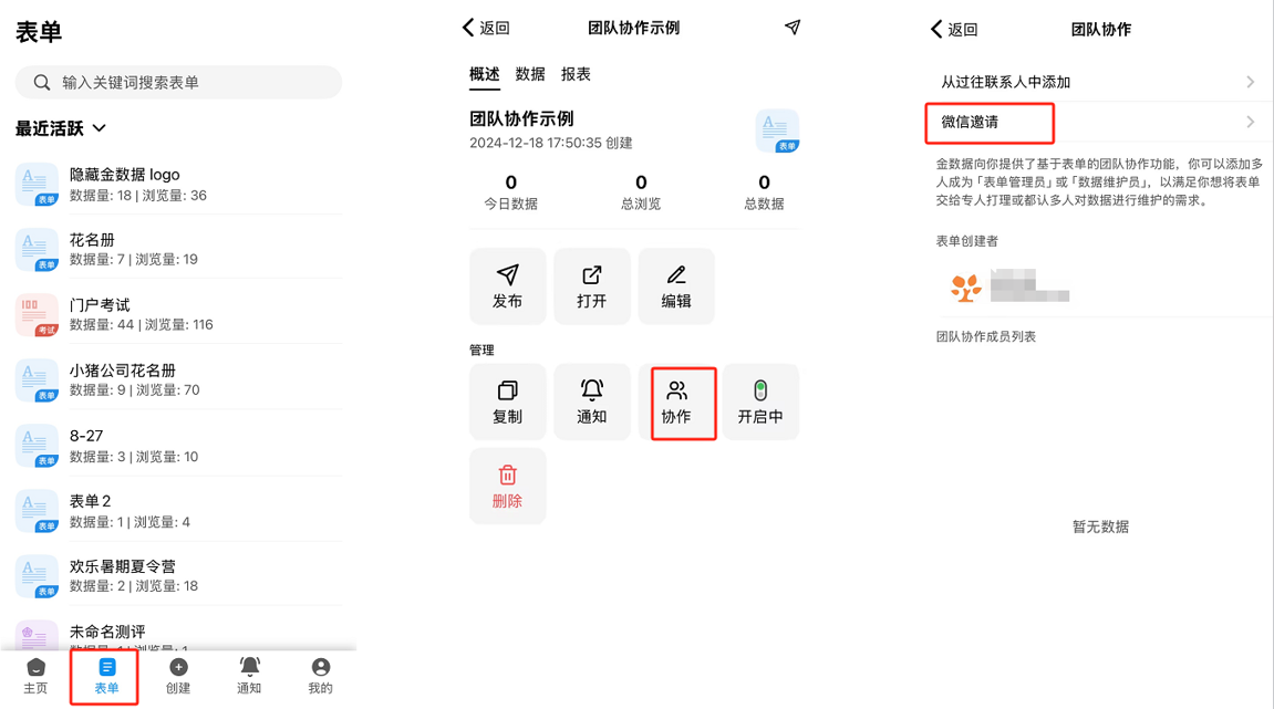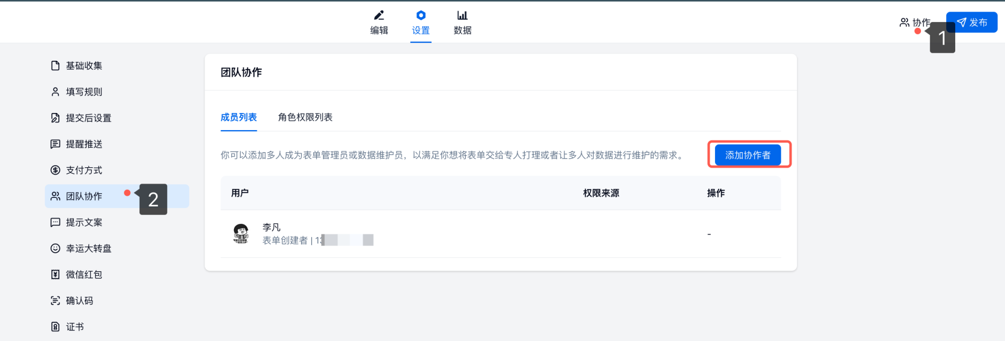 团队协作是表单层面的权限管理,与企业成员(账号层面)是两个独立的概念体系。