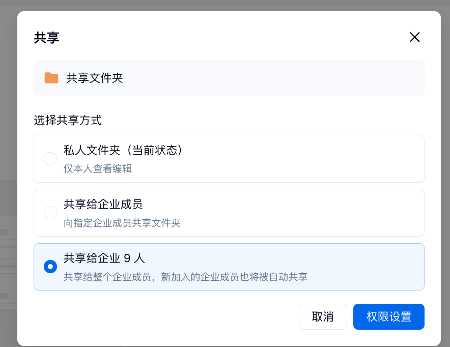 支持一键共享文件夹给企业所有成员,新加入的企业成员也将被自动共享,协作身份可以选择「管理员/查看员」。
