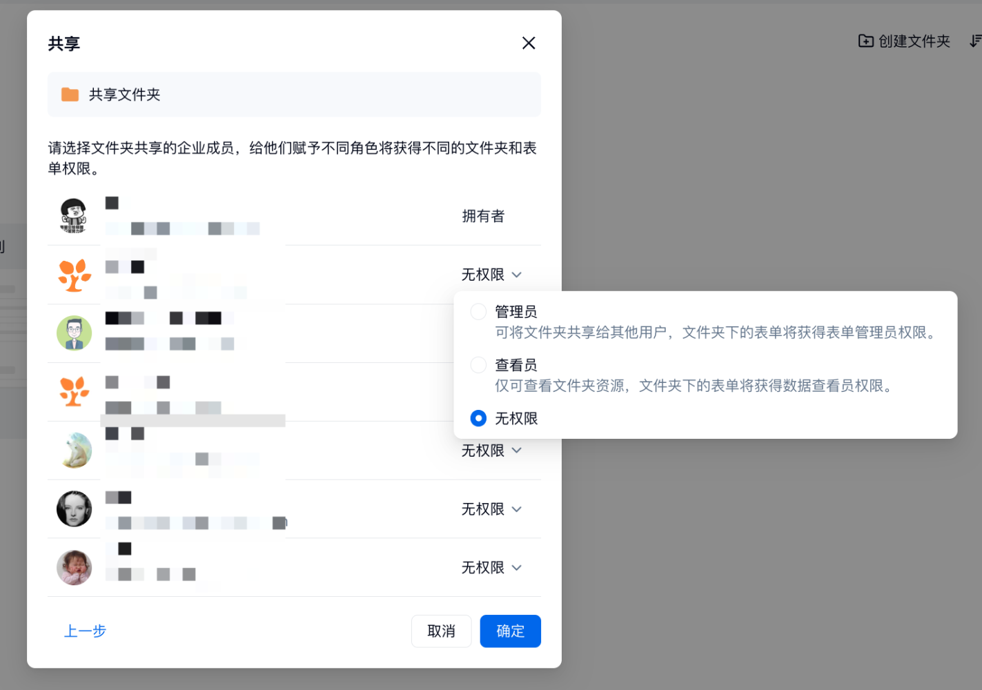 点击后,可以设置允许哪些企业成员加入协作,协作身份可以选择「管理员/查看员」。不允许哪个企业成员协作,就设置为「无权限」。